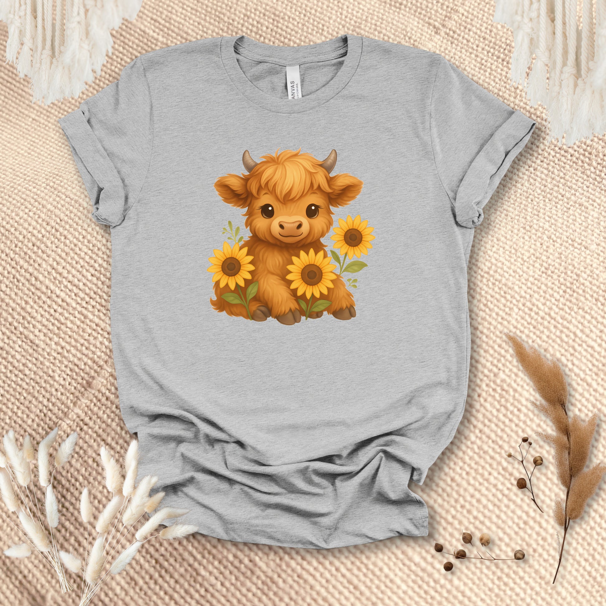 Brighten your wardrobe with this adorable Highland cow T-shirt featuring a sweet fluffy calf surrounded by cheerful sunflowers. Soft, lightweight, and comfortable, this tee is perfect for farm girls, cow moms, homesteaders, and anyone who loves cute cow designs with a warm country feel.