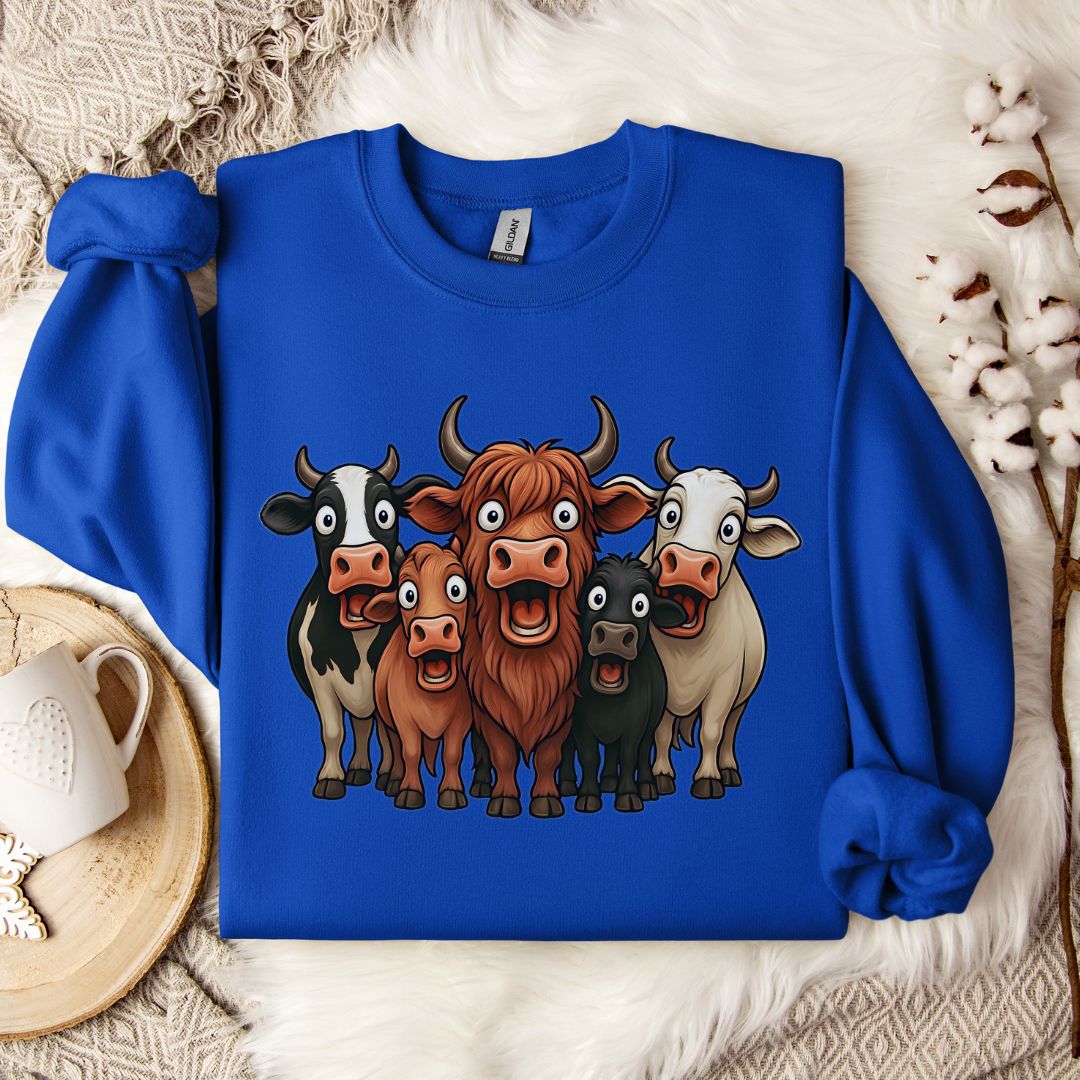 Stay cozy with this adorable cow lineup sweatshirt featuring a group of expressive, wide-eyed cows in multiple breeds. This warm, soft crewneck is perfect for farm life, barn chores, chilly mornings, or relaxing at home.